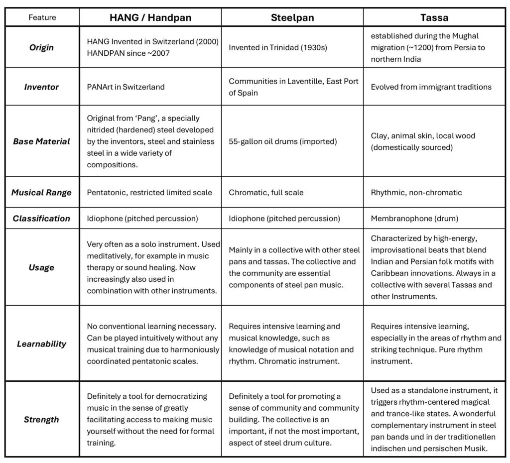 By comparing and highlighting their connections to each other, these three instruments, the HANG & the HANDPAN, the STELLDRUM and the TASSA, could help to trigger these hoped-for thought-provoking impulses and, in the best case, even give rise to new insights.